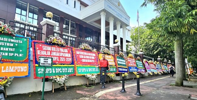 Sejak pagi hari, suasana PTUN Jakarta tampak berbeda. Terpantau sejak pukul 07.00 WIB, puluhan karangan bunga berbaris rapi memenuhi halaman depan PTUN Jakarta, bahkan meluber hingga ke luar area gedung dan sisi jalan. Karangan bunga tersebut merupakan kiriman dari solidaritas SP PLN seluruh Indonesia yang menjadi simbol dukungan moral terhadap gugatan yang diajukan Serikat Pekerja PT PLN (Persero) terkait kebijakan RUPTL 2025–2034.