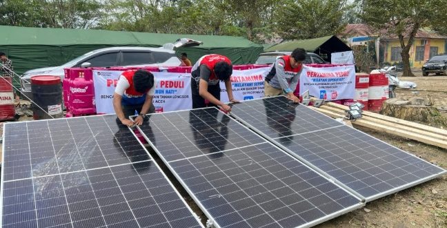 Aceh Tamiang – PT Pertamina (Persero) menghadirkan Pembangkit Listrik Tenaga Surya (PLTS) di sejumlah titik posko pengungsi di wilayah Aceh Tamiang. Tujuh paket PLTS masing-masing unit berkapasitas 590 Wp (Watt peak), inverter 1.000 Wp (Watt peak), baterai 2.000 Wh (Watt hour) serta tujuh paket Solar LED 40 watt yang didatangkan langsung dari Jakarta. Pemasangan instalasi PLTS melibatkan teknisi Perwira Pertamina Peduli yang merakit beberapa komponen PLTS, hingga listrik bisa menerangi tenda pengungsian.